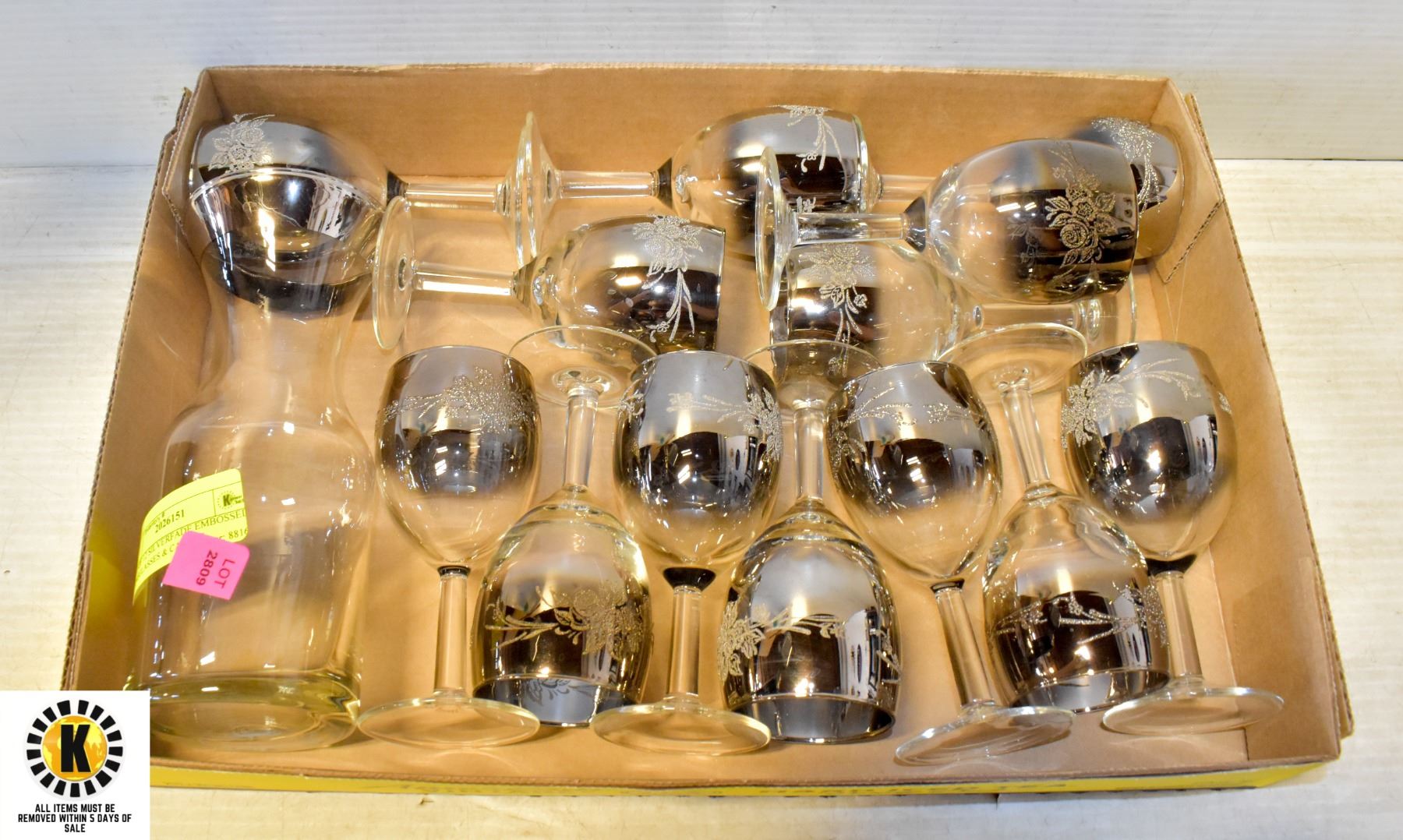 SET OF 12 SILVERFADE EMBOSSED WINEGLASSES & CARAFE