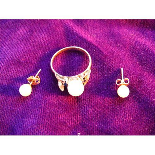 THE 14k RING IS 1.25" (3cm) HEIGHT, 0.75"(2CM) IN DIAMETER (WIDE), THE PEARL ITSELF IS 0.25"(0.7CM) WIDE. THE RING HAS A SMALL GREENISH STONE SET ON EITHER SIDE OF THE PEARL WITH GOLD LEAVES POINTING OUT. THE PEARLS IN THE EARRINGS ARE (0.4CM) WIDE. THIS EXQUISITE SET IS IN GOOD CONDITION.