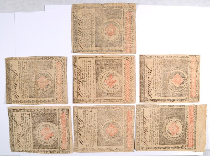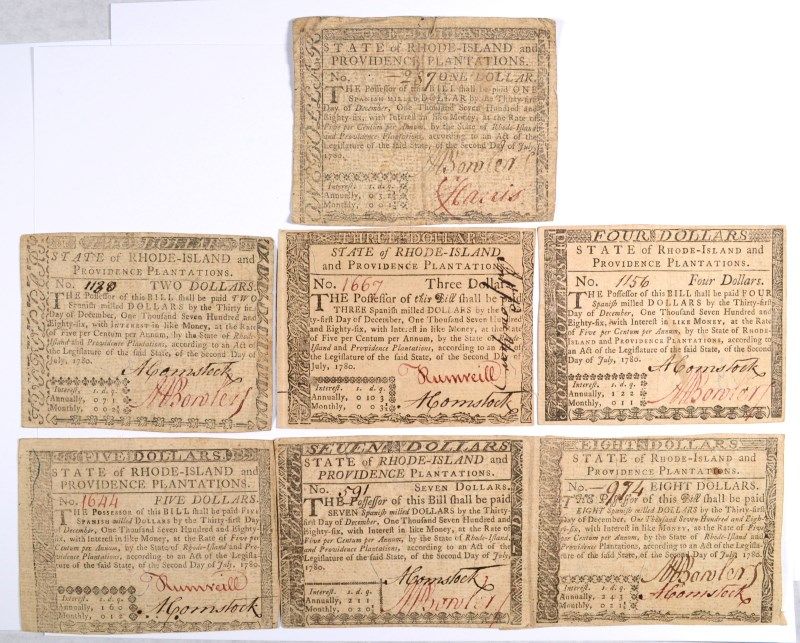 SET OF 1780 STATE OF RHODE ISLAND COLONIAL CURRENCY (1, 2, 3, 4, 5, 7, 8) 7-NOTE