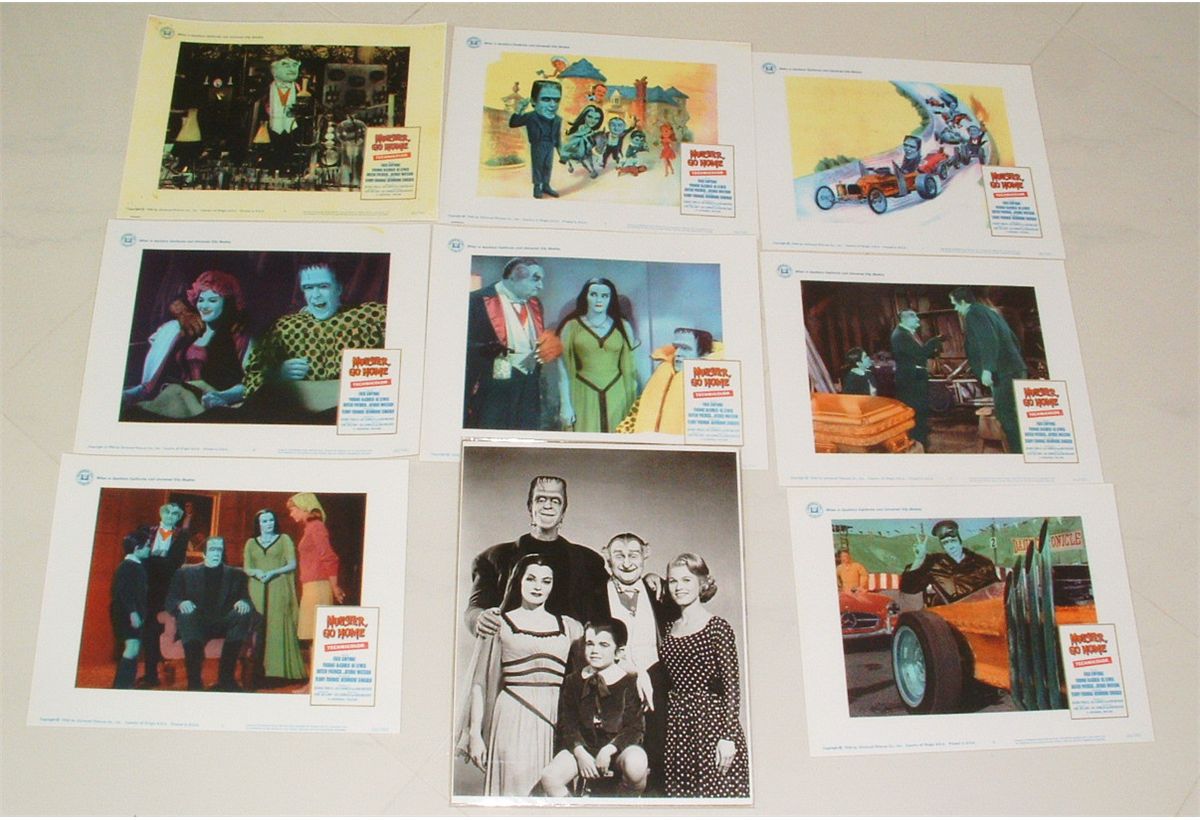 Complete reproduction set of 8, numbered 66/182, lobby promotion cards from The Munsters 1966 movie "Munster, Go Home". Plus 2 photo prints of the family, B&W and full color. All measure 11" x 14"