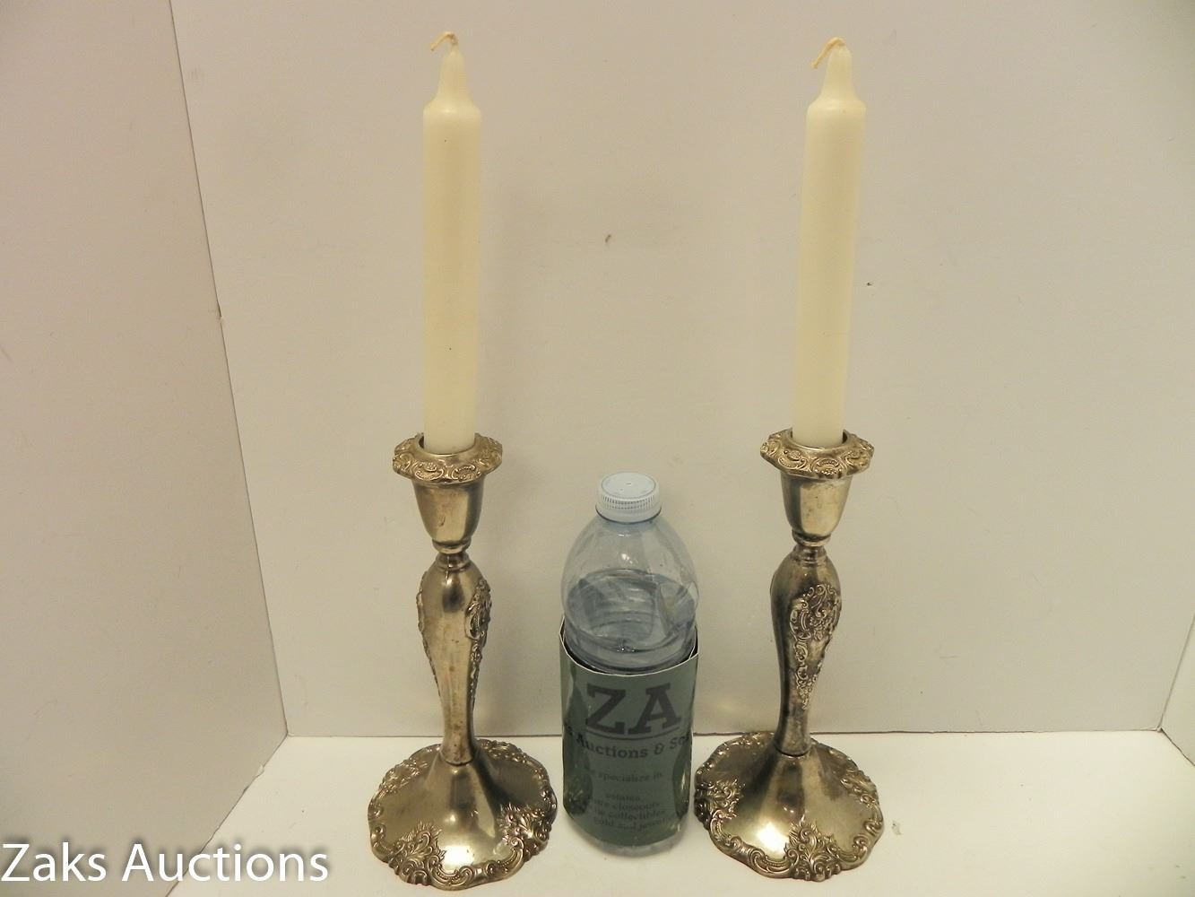 SET OF 2 PLATED HEAVY CANDLE HOLDERS WITH CANDLES