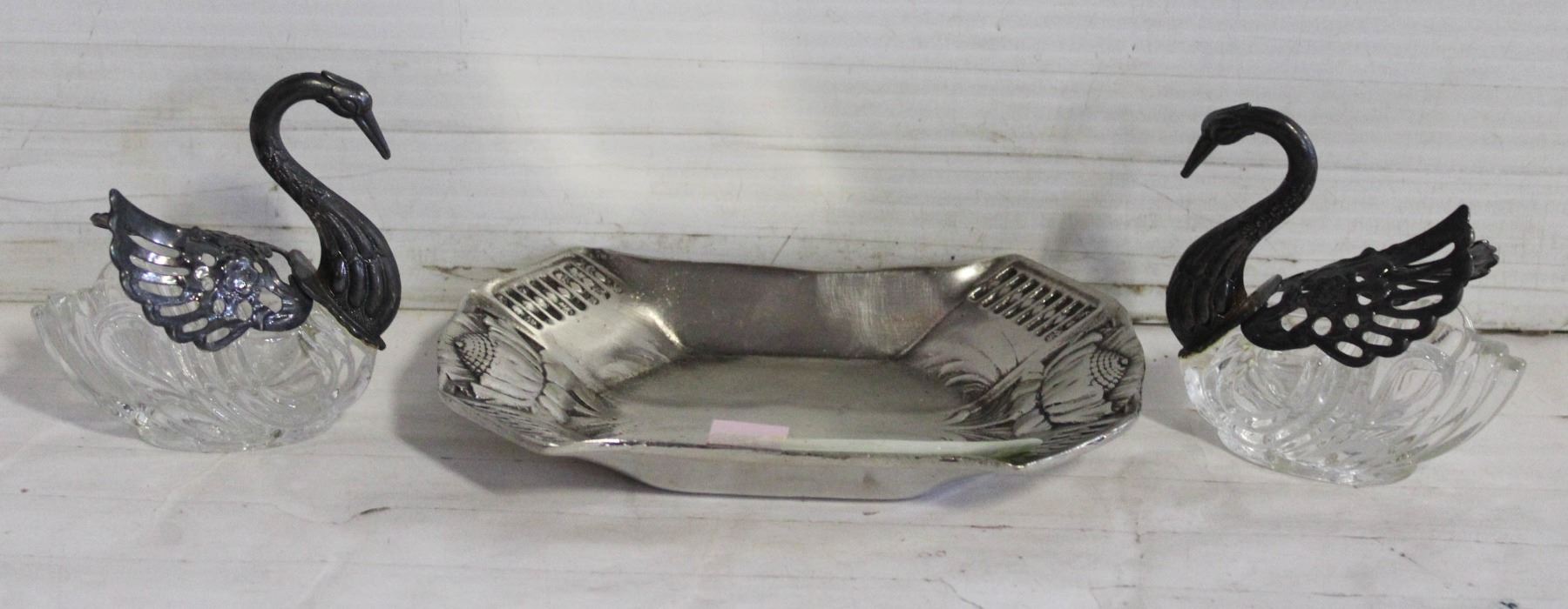 SET OF 2 SWAN GLASS SPOON HOLDERS ON PEWTER TRAY