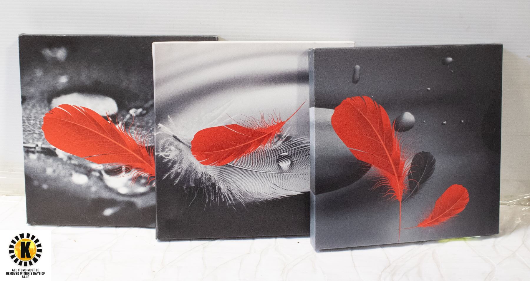 SET OF 3 CANVAS FEATHER PICTURES 12X12 INCH