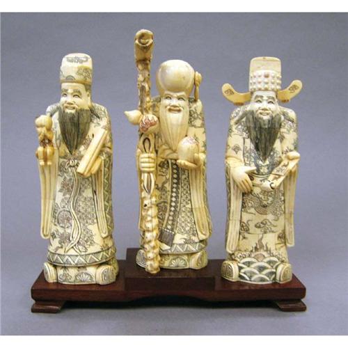 SET OF (3) CARVED BONE CHINESE STATUES with teak stand height: 10" (to be sold with original box)