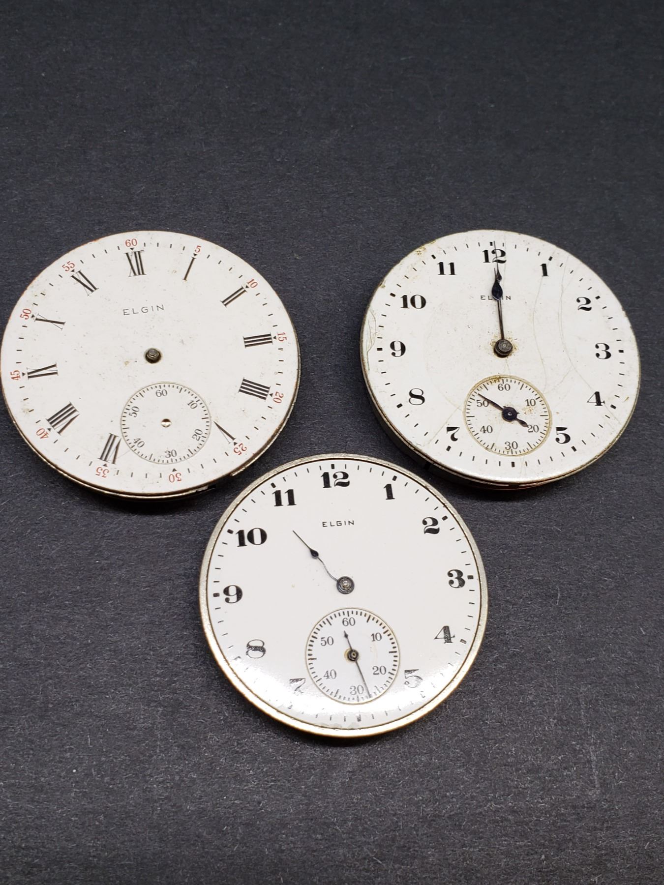 Set of 3 Elgin Watches Pieces are approx 1 3/4" , 1 1/2" All items Located in in Hollywood Florida Warehouse For Shipping Call today for quote they have item numbers and Pak Mail is available for all your custom packaging and shipping needs. We can package, palletize, crate, insure and ship to any Domestic or International location. All packaging and shipping fees must be paid in full before shipment is released. On international shipments, consignee is responsible for all Duties, Taxes, Customs Clearance or any destination fees that apply. Please visit our website @ www.pakmail.com/us770 for contact information or to get a quote. (Let us know you are a winning bidder from the Puckett auction so we can correctly arrange pick up for your item