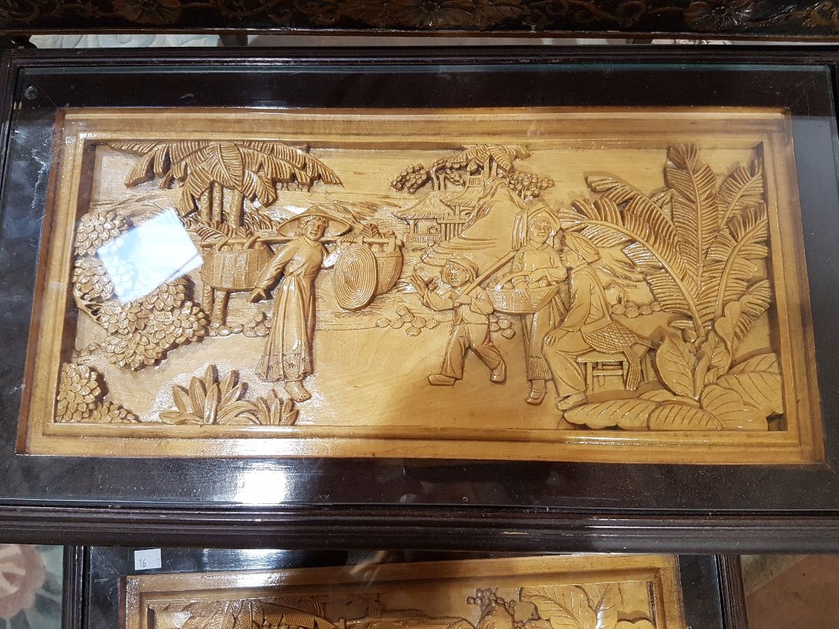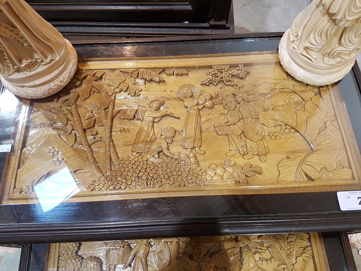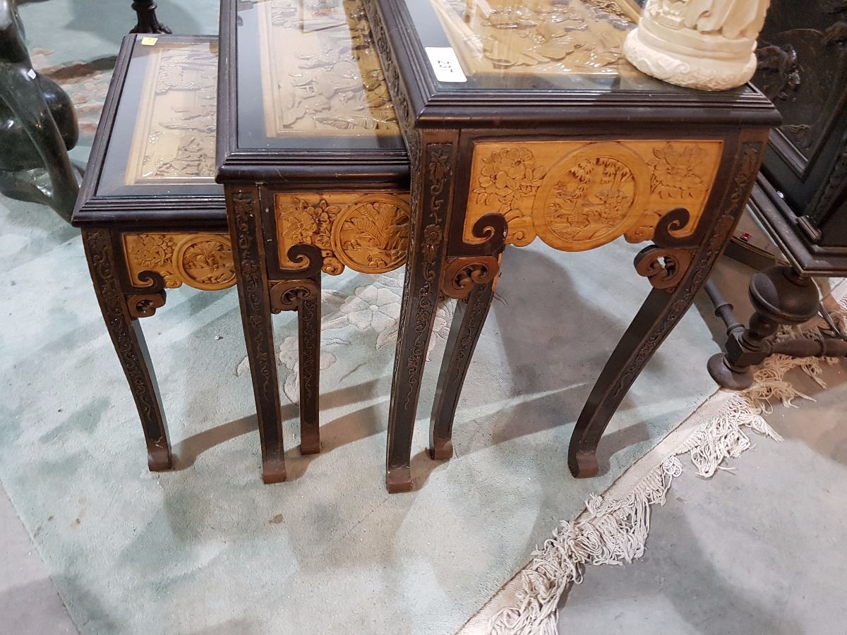 SET OF 3 HIGHLY CARVED ASIAN NESTING TABLES W/GLASS TOPS