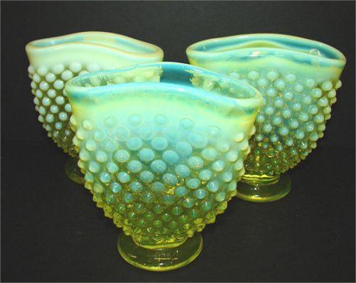 SET OF 3 SMALL VASELINE GLASS PILLOW VASES. Hobnailed pattern. No mark. 3.75” H