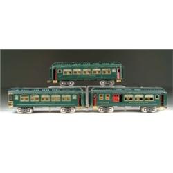 SET OF 3 STANDARD GAUGE LIONEL PULLMAN CARS. Lot includes #428, #429, and #430 in dark green with orange window trim and maroon doors riding on 200 series freight car type trucks. All cars have original oiling instructions on bottom. One car has a loose step. CONDITION: Car #428 has considerable chipping on roof and some flaking near one door. Car #429 has a few minor touch ups on the roof and a scratch on one side. Car #430 has a sizable scratch and rub mark along edge up to opening of window sets. Some chipping scraping and wear on all car diaphragms. EC 1-4368 (550-850)