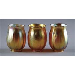 Lot 184 SET OF 3 TIFFANY TULIP SHADES Nicely matched set of three gold Tiffany tulip shades with pronounced ribbing and crimped bottom edges. Wonderful purple iridescence. Each signed “LCT”. SIZE: 2-1/4” fitter x 5” t x 3” w. CONDITION: Very good with minor grinding to fitter rims. 5-70430