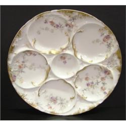 SET OF 4 HAVILAND OYSTER PLATES. Floral transfer & gilt decorated. All shows signs of loss to gilt. Three of the four are marked on reverse “Porcelaine, Theo. Haviland-Limoges France”. 8.25” H