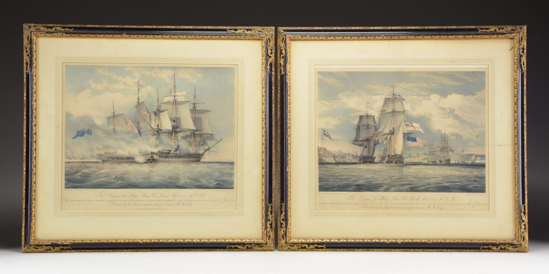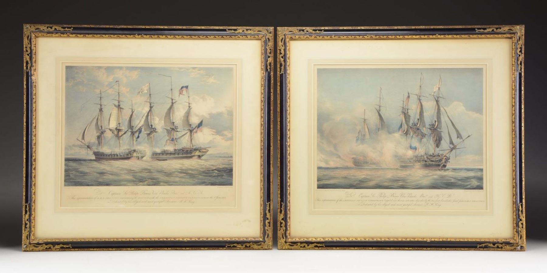 CHESAPEAKE 1813. Each lithograph 17" x 15" housed in contemporary 25" x 23" frames with gilded lead decoration. Lithographs were printed in 1830 in London by Haghe after the paintings by JC Schetky. The four prints are: HMS Shannon opening fire with starboard guns on American frigate Chesapeake; the Starboard view of Chesapeake, with damage to rigging after first broadsides from HMS Shannon; the HMS Shannon preparing to board American frigate Chesapeake; and the HMS Shannon leading the prize American frigate Chesapeake into Halifax Harbour. This is a beautiful complete set in matching 19th century frames. CONDITION: appear very good to fine with good color, gilded lead decoration with scattered areas of damage and other cosmetic blemishes to frames. PROVENANCE: old tags from unknown date Opfer auction; Martin Lane Historic & Western Americana Lifetime Collection. (02-21510/JS). $3,000-4,000.