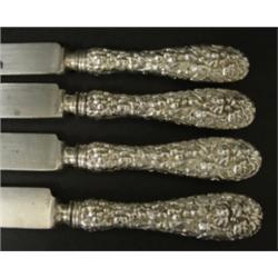 SET OF 4 STIEFF STERLING SILVER DINNER KNIVES. Blade is marked "The Stieff Company Silversmiths". Reverse of handle is monogrammed with "S". 9.5" L