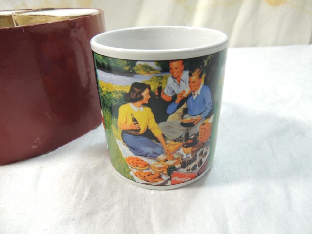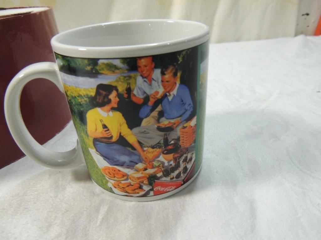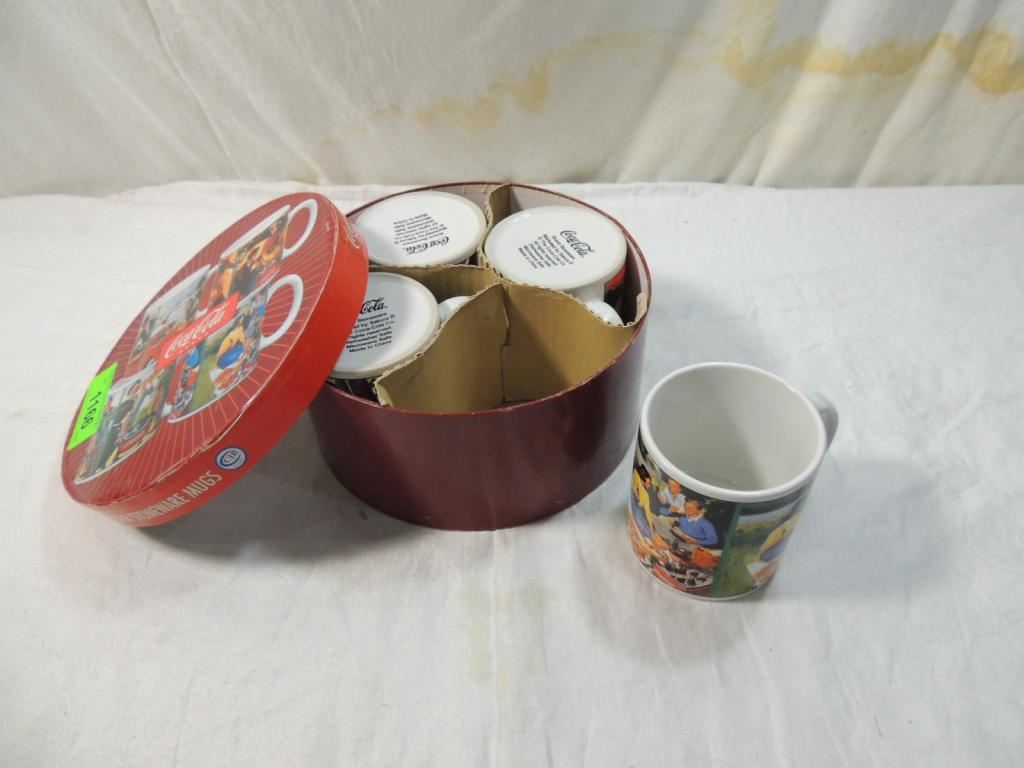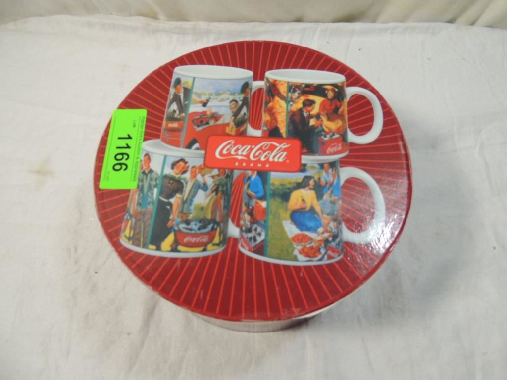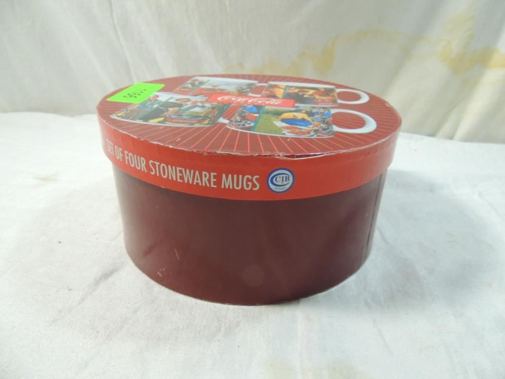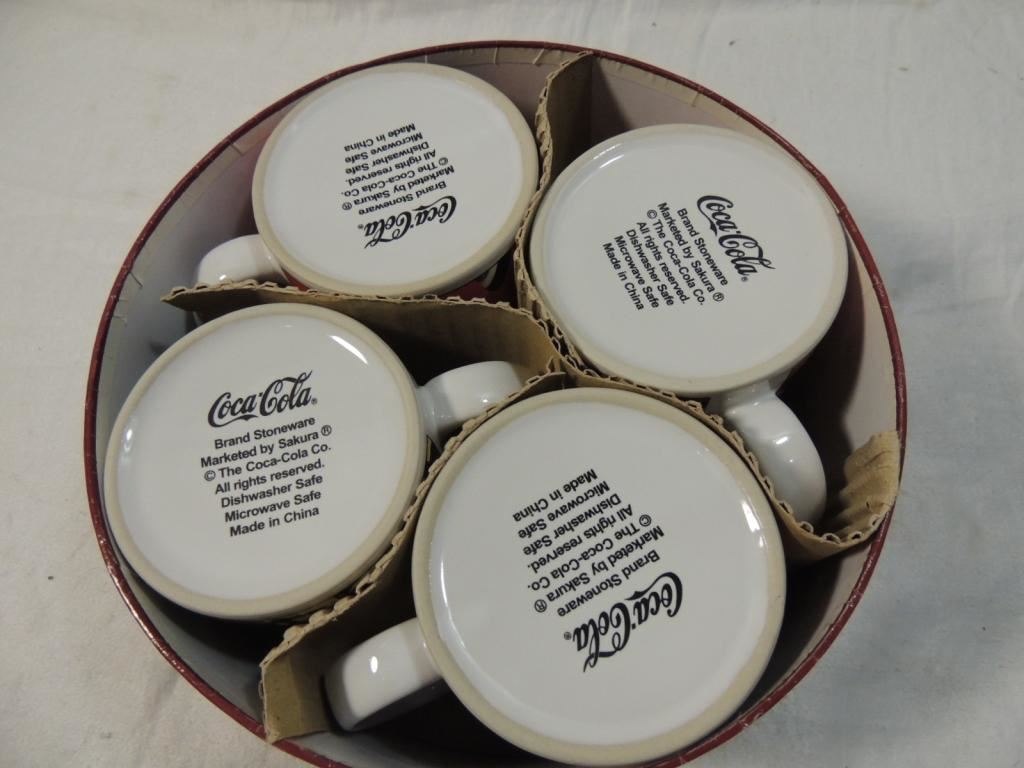 TAILGATING MUGS COCA COLA BRAND STONEWARE MUGS. FOUR STONEWARE COFFEE, TEA, MUGS, COLLECTIBLE AS SHOWN SEE PHOTO FOR MORE DETAILS.