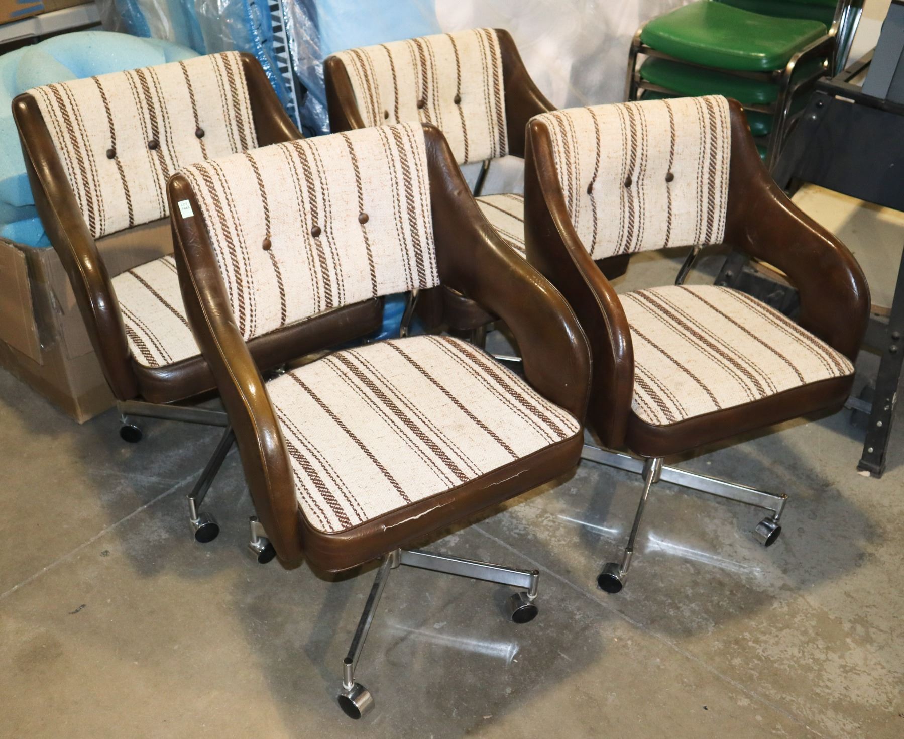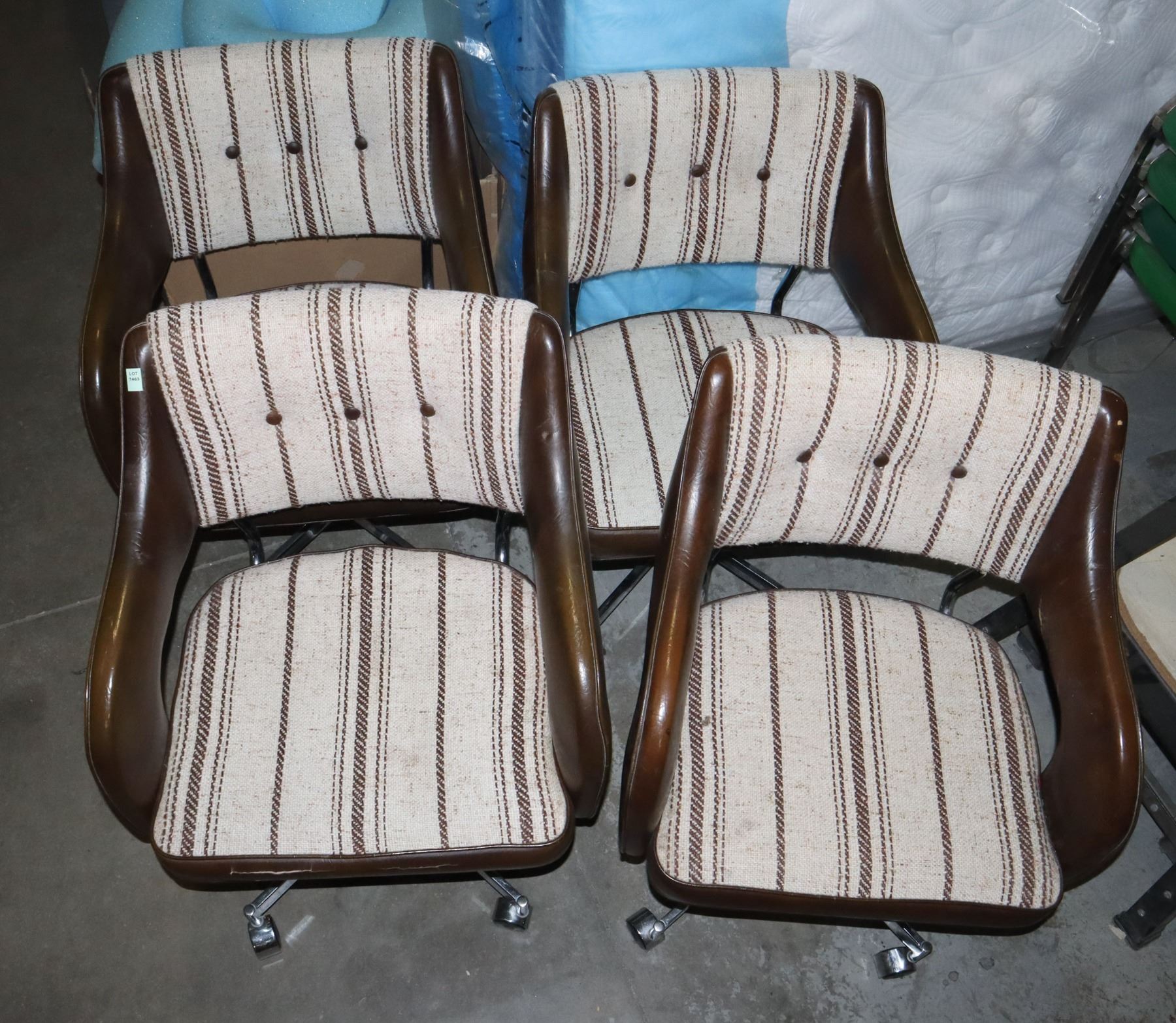 OVERALL IN VERY GOOD CONDITION, ONE WHEEL FALLS OFF OF ONE CHAIR WHEN LIFTED IN THE AIR BUT IS FINE WHEN ROLLING. ONE CHAIR HAS MORE WEAR FROM BEING SAT IN MORE. MADE IN CANADA