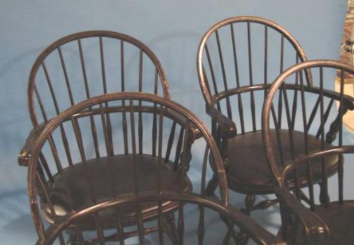 SET OF 4 BLACK PAINTED WINDSOR STYLE ARM CHAIRS. Chairs have padded faux leather seats and show loss to paint at areas. 36" H to top of back, 18" H to top of seat, 21" W