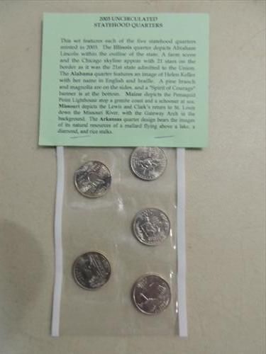 SET OF 5 2003-P STATEHOOD CLAD WASHINGTON QUARTERS.  AS SHOWN.  VIEW PICTURE FOR DETAIL.
