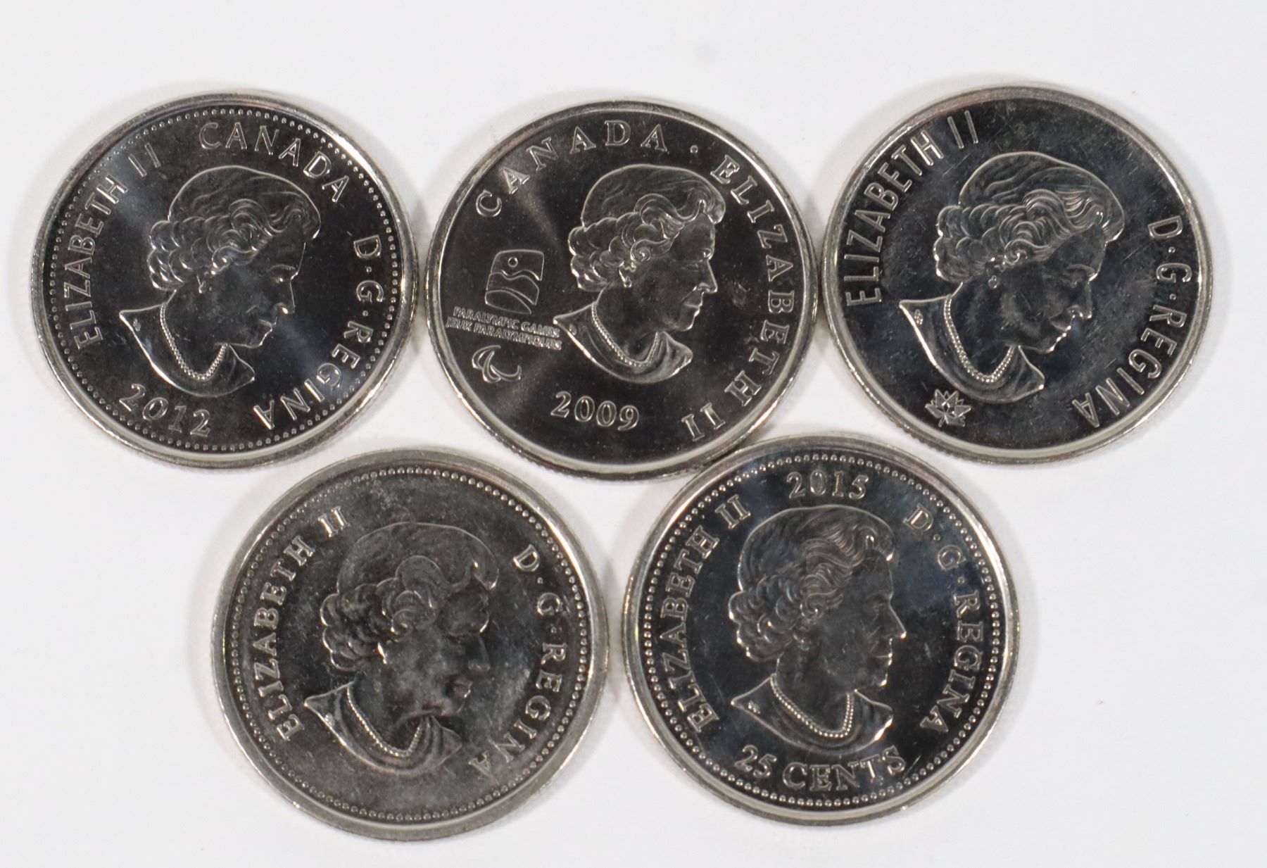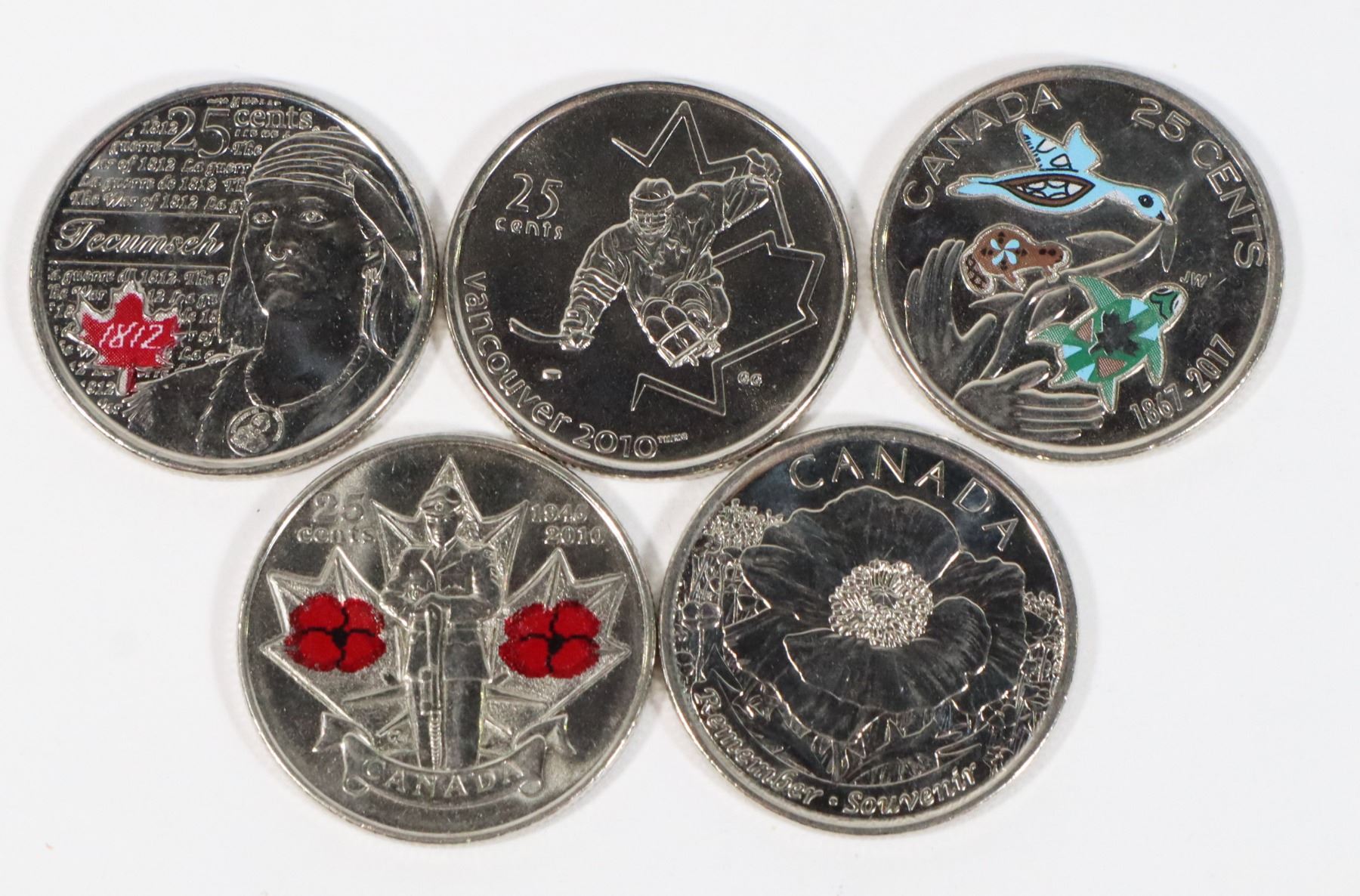 SET OF 5 CANADIAN QUARTERS, MIXED COLOURS