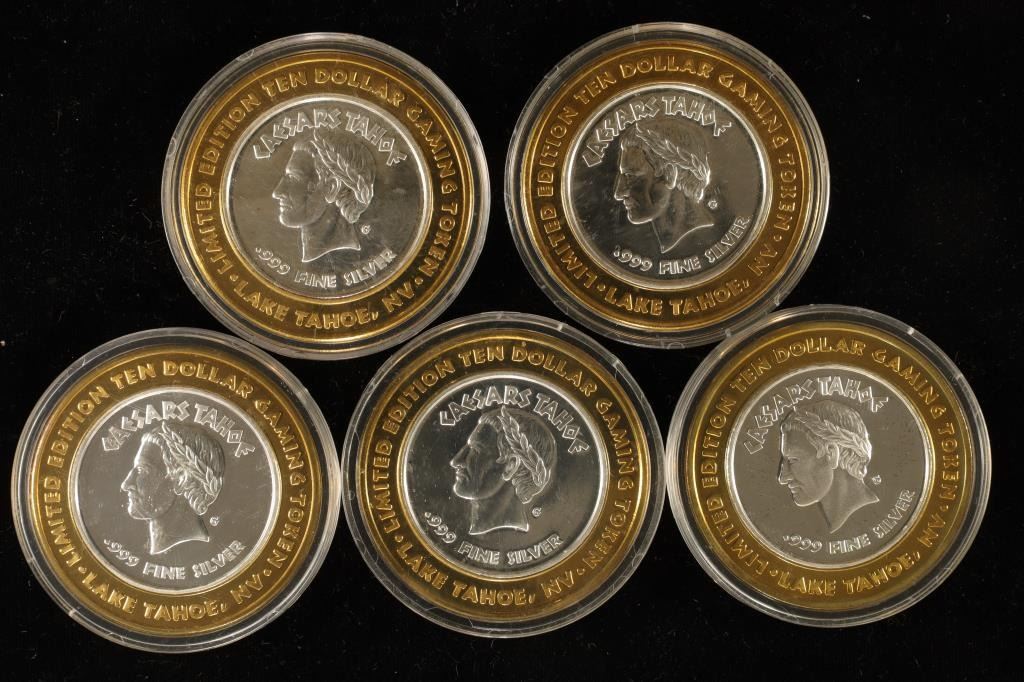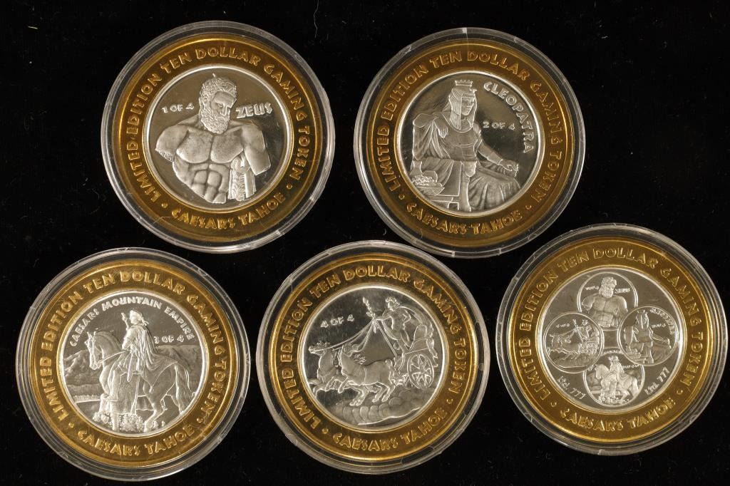 TAHOE AND INCLUDES: ZUES, CLE PATRA, CAESARS MOUNTAIN EMPIRE, HORSE & CHARIOT WITH RIDER AND ONE COIN WITH ALL DESIGNS. LIMITED EDITION SET OF ONLY 777, ALL IN HARD PLASTIC CAPSULES