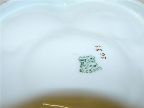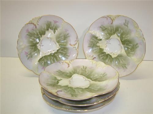 SET OF 5 GERMAN OYSTER PLATES. Hand painted leaf and gilt decorated. Marked on bottom with green shield and “Weimar/Germany”. Some plates show roughness around bottom rim of base. 8.25” Dia.