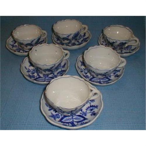 This lot consists of a matched set of 6 MEISSEN BLUE ONION cups that are 3 7/8" in diameter and 6 saucers that are 5 3/4" in diameter. The saucers are marked, B.S.M. & CO. MEISSEN for T.C. BROWN, WESTHEAD MOORE & CO., SHELTON, GREAT BRITAIN 1858. The cups are unmarked except for several that are marked with numbers. 1 saucer has a minor edge chip with a 1/2" hairline and 1 cup has a chip on the inside edge.....all others are in perfect condition, no chips, cracks, breaks or repairs.