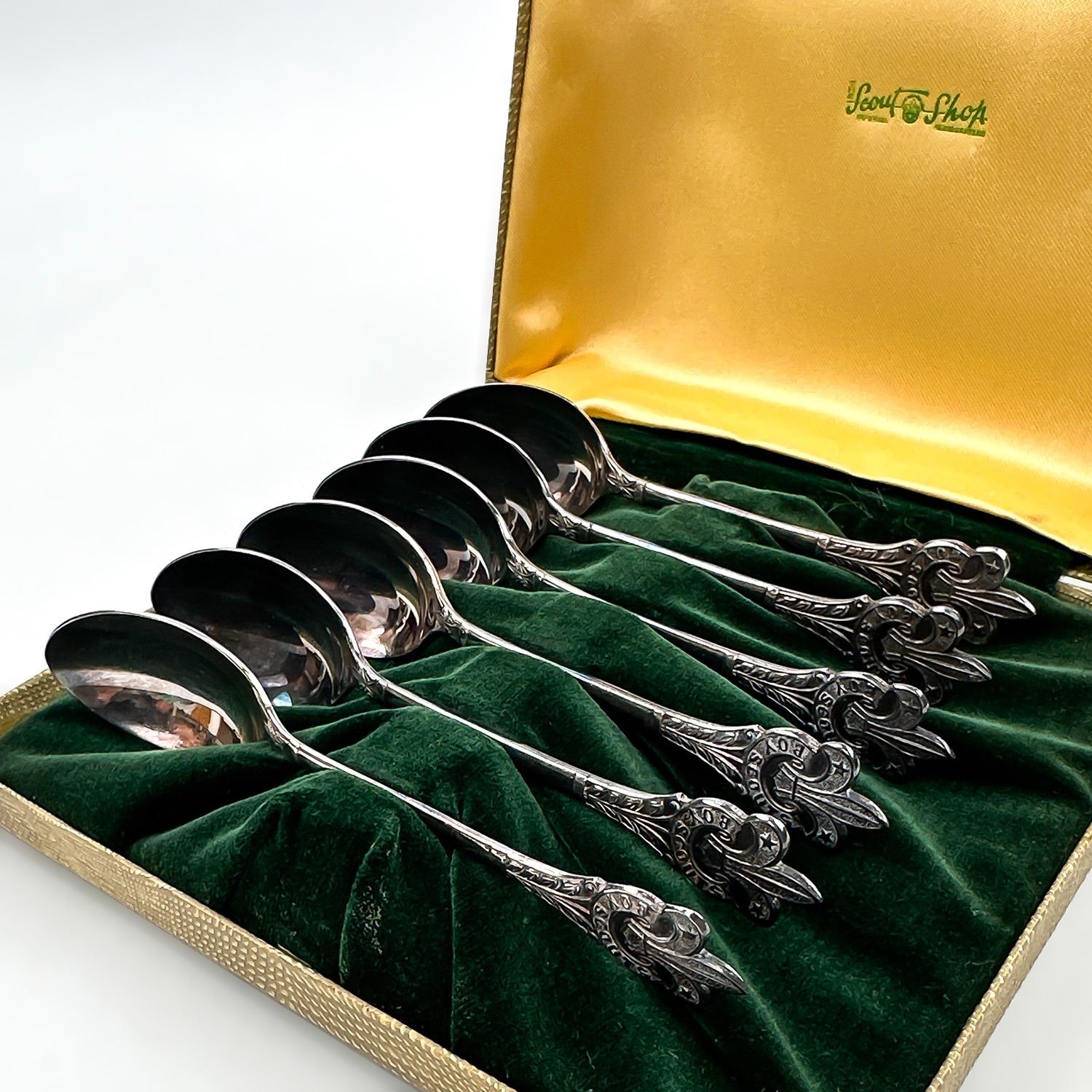 #8966 - VINTAGE BOX OF 6 SILVER PLATED (EP - ELECTROPLATED) BOY SCOUT SPOONS. LOGO LABEL ON BOX LID READS: THE SCOUT SHOP - IMPERIAL HEADQUARTERS. SPOONS MEASURES: 4.5” (11.5 CM) LONG AND THE BOX IS 5.75” (14.5 CM) LONG BY 5.125” (13 CM) WIDE***ITEM(S) LOCATED IN LETHBRIDGE ALBERTA. FREE TRANSPORT TO EDMONTON OFFICE AVAILABLE FOR THIS AUCTION. WORLDWIDE SHIPPING IS AVAILABLE FOR ALL ITEMS