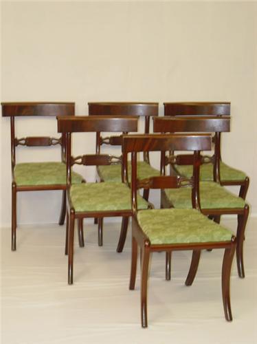 SET OF (6) CENTENNIAL REGENCY STYLE MAHOGANY DINING ROOM CHAIRS W/ CARVED SPLATS & SABRE LEGS W/ GREEN UPHOLSTERED SEATS - SOILING, WEAR & IMPERFECTIONS
