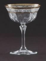 Italian lead crystal - Venetian hand painted 14 kt. gold artwork - Venetian hand painted wide white design - Measures: 7.5" H - Capacity: 6 ounces