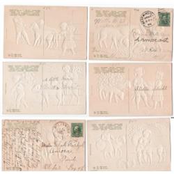 SET OF 6 EASTER POSTCARDS. All feature children with lambs and are made by Paul Finkenrath, Berlin. Relief decorated and two are gilt decorated. Marked on reverse "Printed in Germany" with PFB logo with crossed compasses and No. 7482 Relief and No. 7485 Brilliant. One is postmarked 1908 and one is postmarked illegibly.