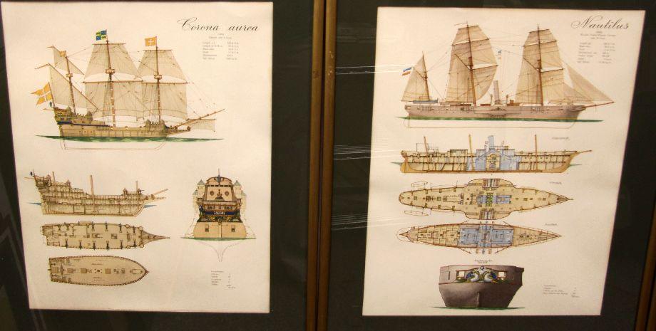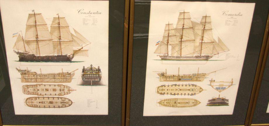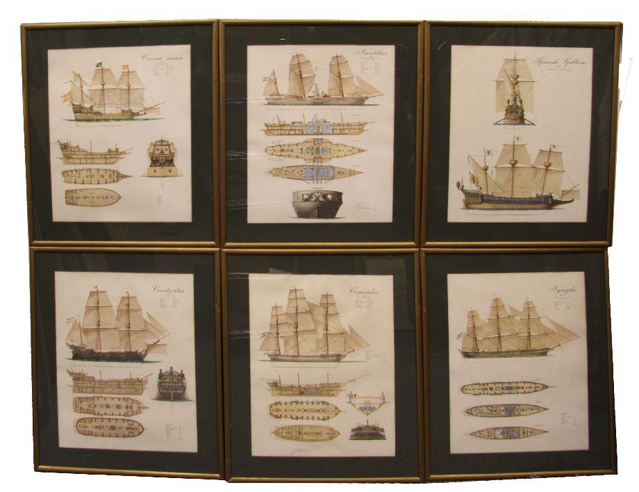 Included are technical colored drawings of Corona-Aurea (1450), Spanish Galleon (1600), Constantia (1750), Concordia (1830), Nautilus (1860) and Nymphe (1865). These are prints of original German drawings. Along bottom boarder is printed " " the orignal of this reproduction is in the possession of Schlieker Werft, Hamburg". They are all matted and framed alike in simple gold frames (some with scratches and damage) and measure 22 by 27 inches with image sizes at 16 by 21 inches. Overall condition is good.