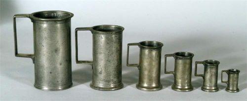 SET OF 6 GRADUATED PEWTER MEASURES, 2"-7" high, the largest 1 litre, CONDITION: excellent, normal wear from use. PACKING AND SHIPPING BY FAIRFIELD AUCTION WITHIN CONTINENTAL USA (excluding insurance) $30,