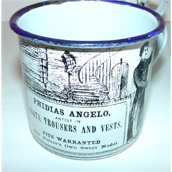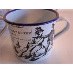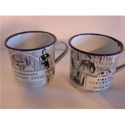 SET OF 6 GRANITEWARE HANDLED CUPS. All feature Victorian era advertisements. All show minor signs of wear. 2.75" H