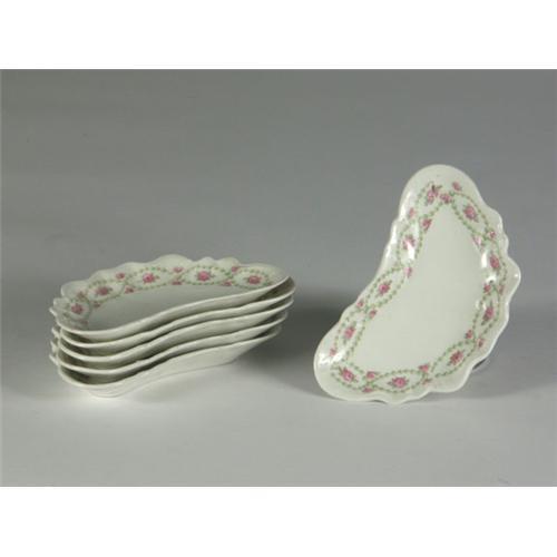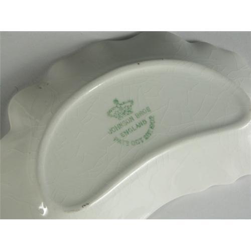 Six Johnson Bros. stoneware crescent-shaped bone dishes with transfer decoration, mid-20th c. 6.25'' L. One has stained tight hairline crack at corner, all with kiln marks and crazing.
