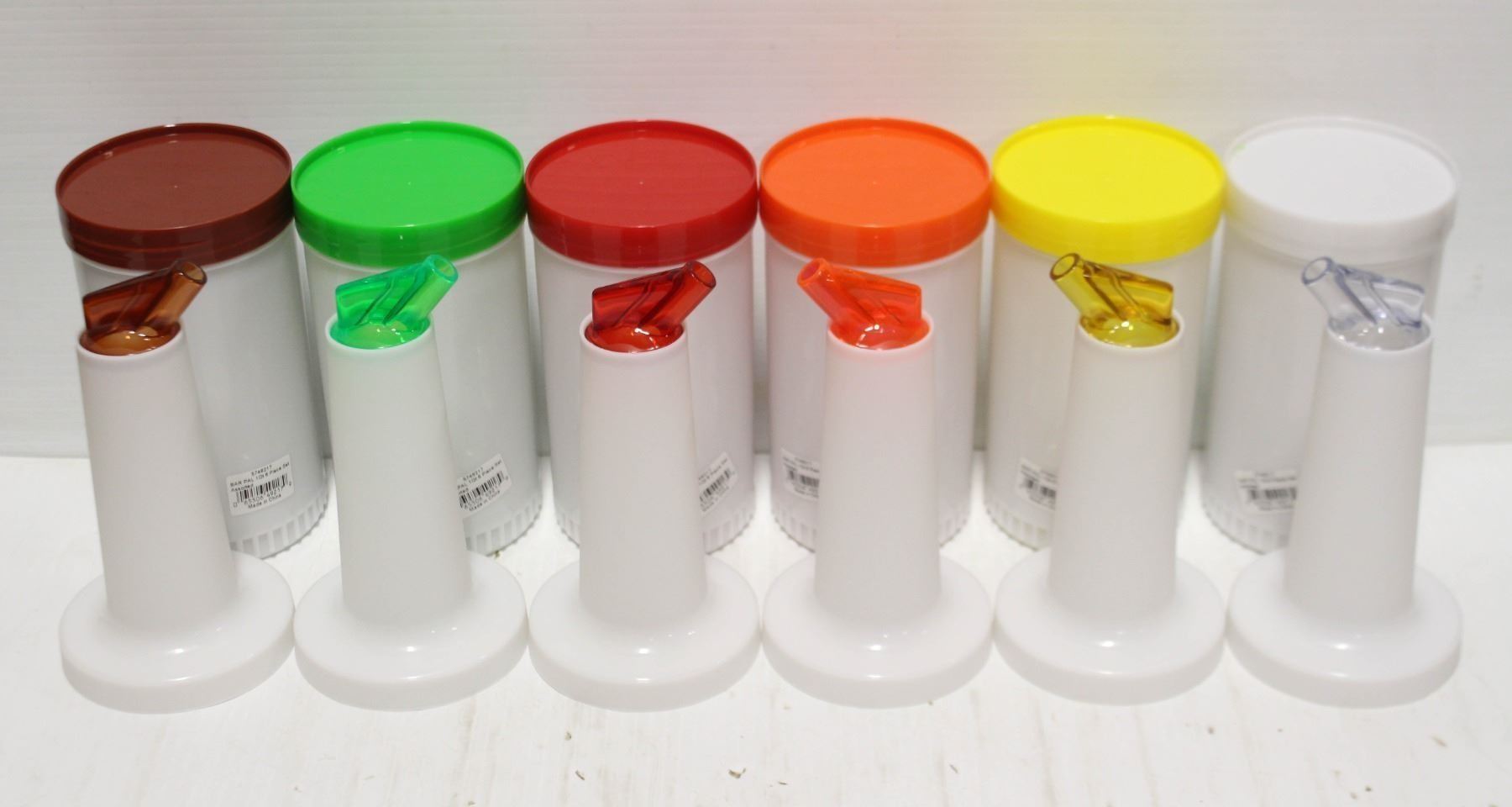 CONTAINERS. EACH COMES WITH 2 LIDS, ONE WITH A SPOUT AND ONE JAR LID FOR STORAGE (12 LIDS TOTAL). BROWN, GREEN, RED, ORANGE, & YELLOW LIDS. GREAT FOR COCKTAIL MIXES, PANCAKE BATTER, BROTHS, & MORE.