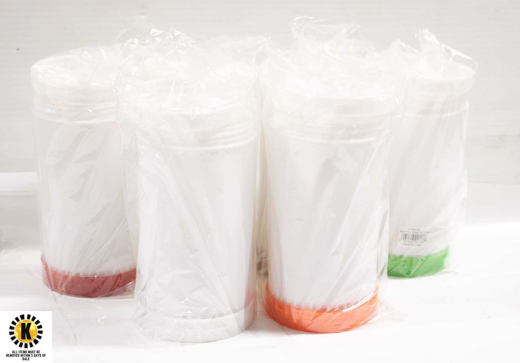 CONTAINERS. EACH COMES WITH 2 LIDS, ONE WITH A SPOUT AND ONE JAR LID FOR STORAGE (12 LIDS TOTAL). BROWN, GREEN, RED, ORANGE, & YELLOW LIDS. GREAT FOR COCKTAIL MIXES, PANCAKE BATTER, BROTHS, & MORE.