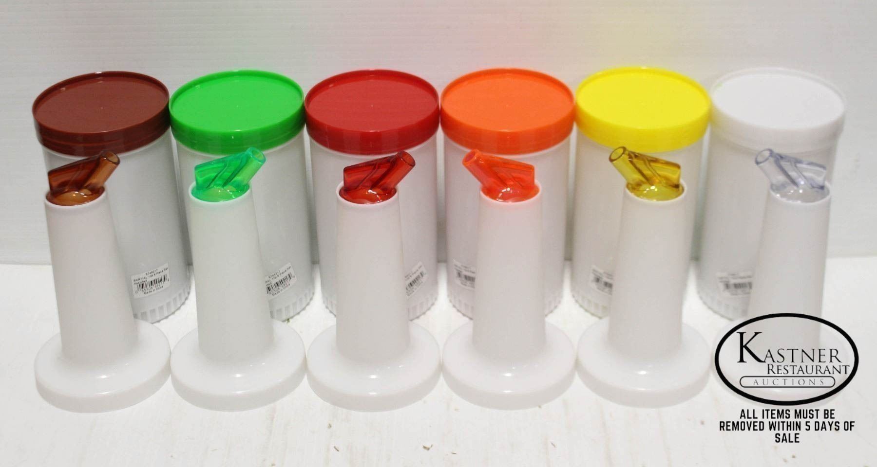 CONTAINERS. EACH COMES WITH 2 LIDS, ONE WITH A SPOUT AND ONE JAR LID FOR STORAGE (12 LIDS TOTAL). BROWN, GREEN, RED, ORANGE, & YELLOW LIDS. GREAT FOR COCKTAIL MIXES, PANCAKE BATTER, BROTHS, & MORE.
