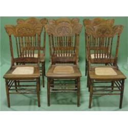 SET OF 6 OAK PRESSED BACK DINING CHAIRS WITH CANE SEATS. Good overall cond. Cane is in excellent cond. 41"H, 18.25"W, 18.5" to the top of the seat