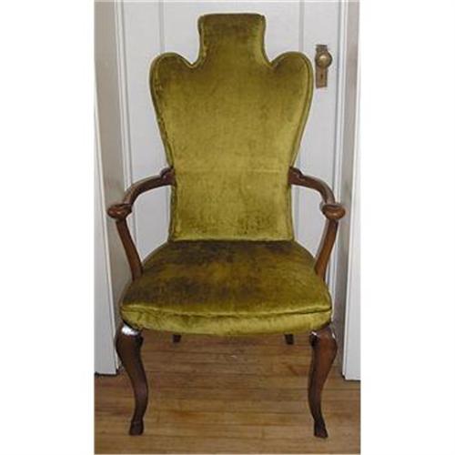 What an unusual set of chairs we have here! The frames are made of solid walnut and upholstered with a classy olive green velour fabric. There is some looseness where the backs meet the seats on the side chairs. The arm chairs are solid. The chairs feature high upholstered backs with regal crest tops. The front legs of the chairs have a unique cut and curved line that leads down to a hoofed cut foot. The back legs are smooth tapered. The arm chairs feature a curled cut hand rest on the arms unlike anything this dealer has seen before. The side chairs measure 43.5" tall by 21" wide and 22" deep. The arm chairs measure 43.5" tall by 22.5" wide and 24" deep. A truly unique set of chairs with lots of potential for the right buyer.