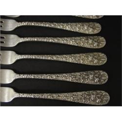 SET OF 6 STIEFF STERLING SILVER HORS D'OEUVRES FORKS. Marked on reverse of handle "Stieff Sterling". 5.5" L