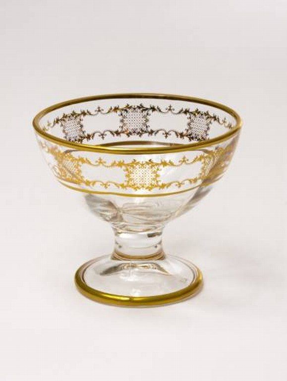 SET OF 8 FINE ITALIAN CRYSTAL DESSERT CUPS - VENETIAN HAND PAINTED 14 KT GOLD DESIGN - MEASURES 4L" x 4W" x 3.3H"