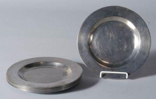 SET OF 8 MATCHING PEWTER PLATES, 9 1/4" diameter, marked R.I.B. underneath, 18th century,, CONDITION: excellent, no damage or repairs. PACKING AND SHIPPING BY FAIRFIELD AUCTION WITHIN CONTINENTAL USA (excluding insurance) $30,