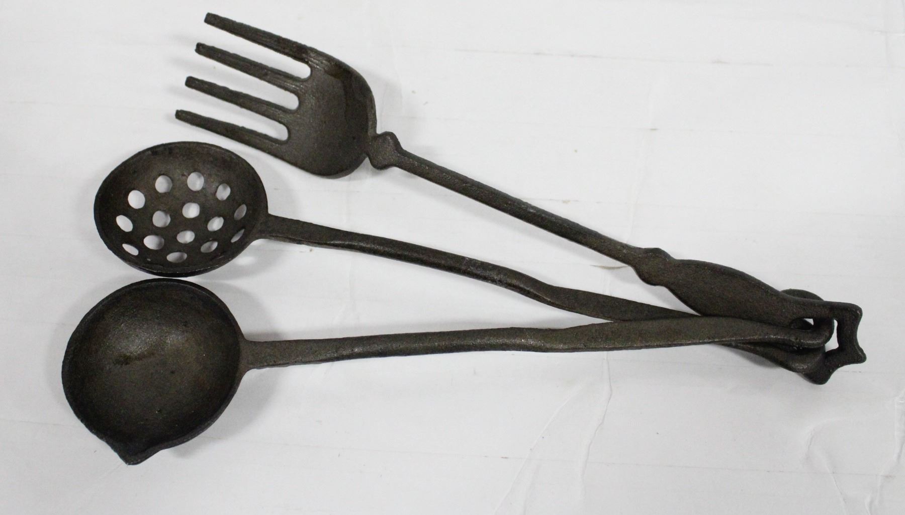 SET OF CAST IRON UTENSILS LADLE, STRAINER AND