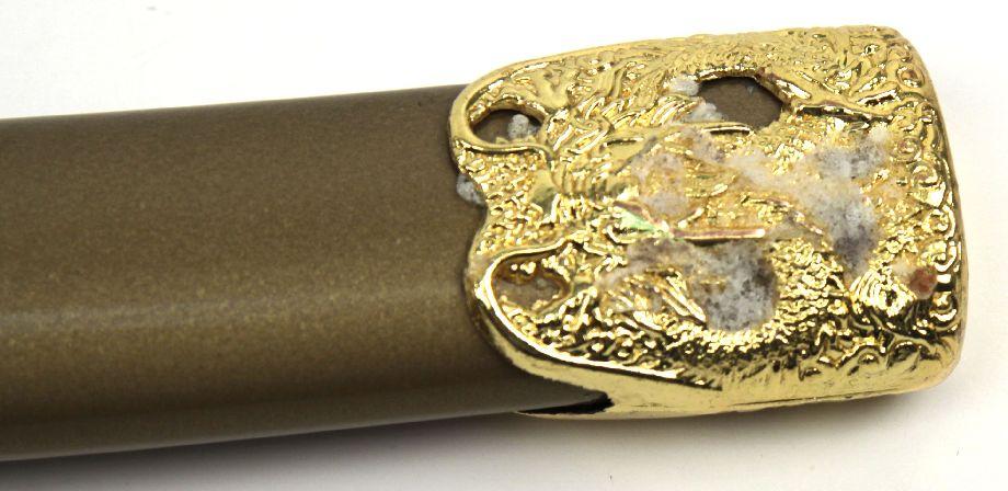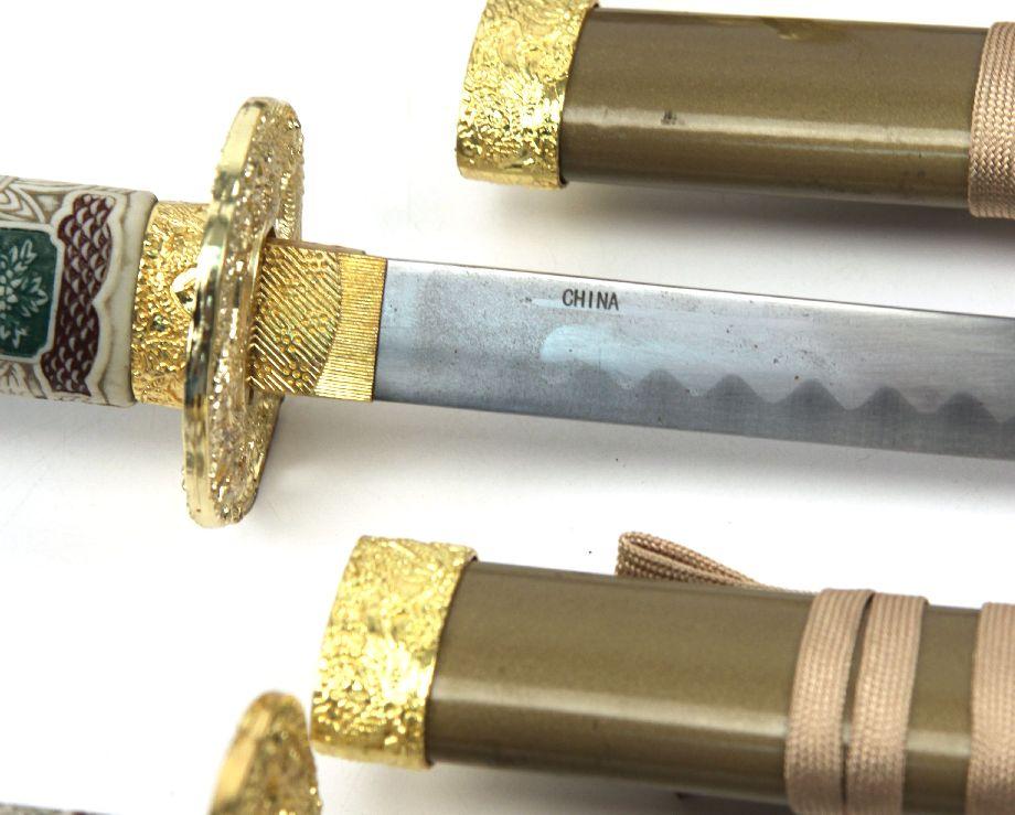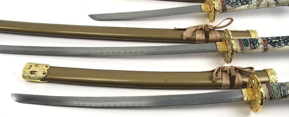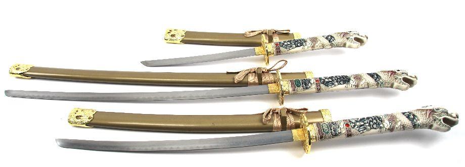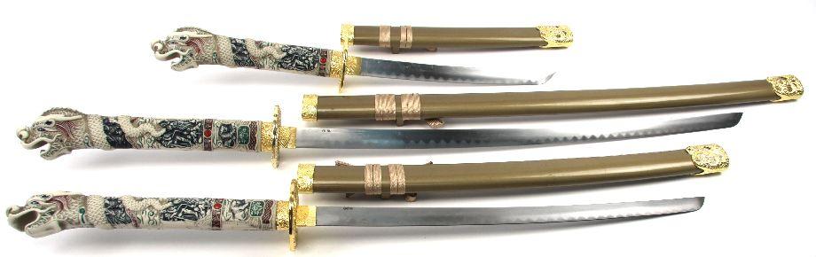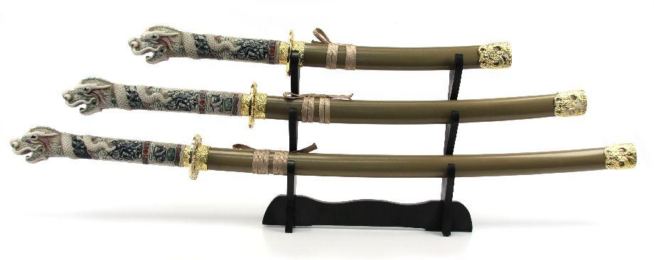 Set of 3 decorative faux Japanese style swords, with display rack. Figural dragon head faux ivory plastic handles. Blades measure 14 to 29 inches. Excellent condition. Made in China.