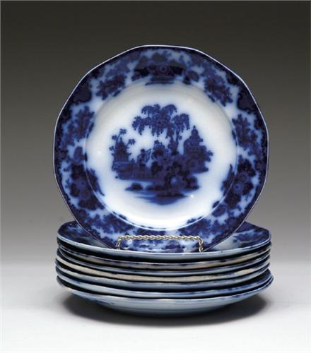 SET OF EIGHT FLOW BLUE PLATES IN THE ""SCINDE"" PATTERN. SIZE: 8-1/4in.. CONDITION: Very good, minor light knife marks. One plate is discolored. 9-25820