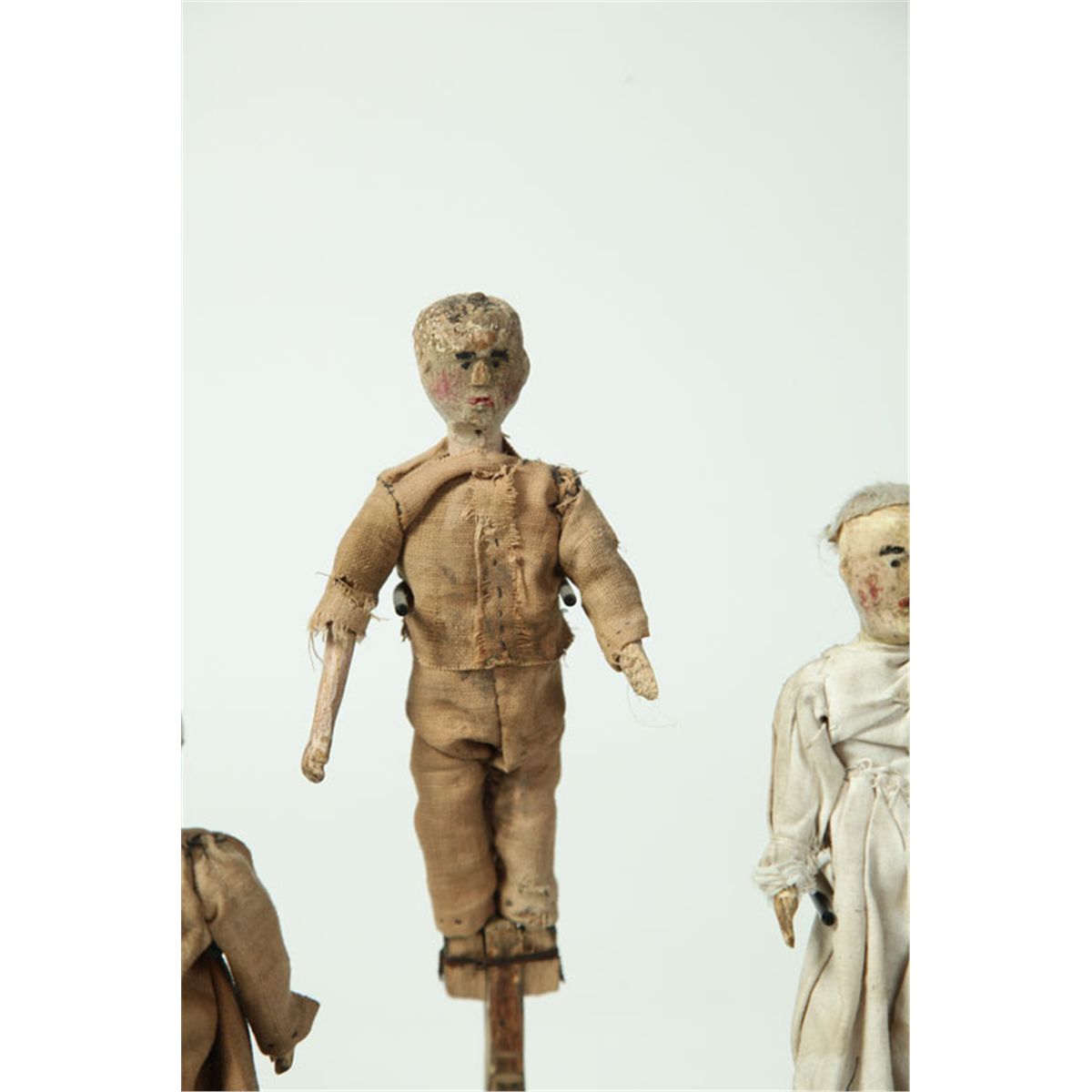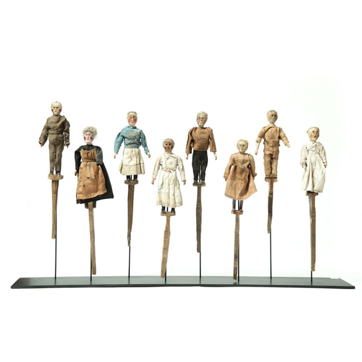 Tennessee or North Carolina, late 19th century, maple and fabric. Three men and five women, each in costume with painted faces. Minor damage. Each approximately 13"h., on a custom stand, 31"l. Ex David Good (Ohio), ex Monty Young (Tennessee).