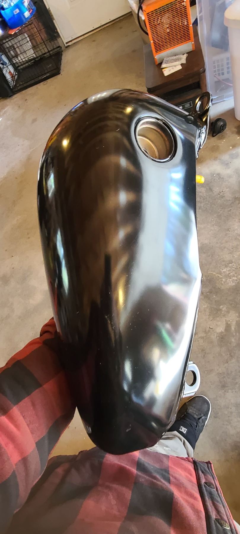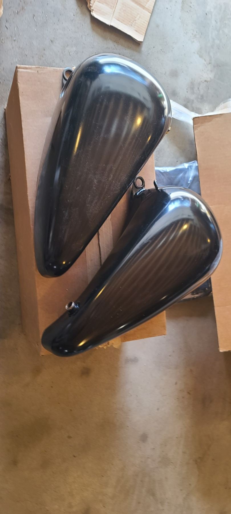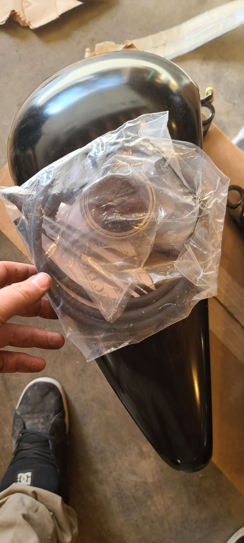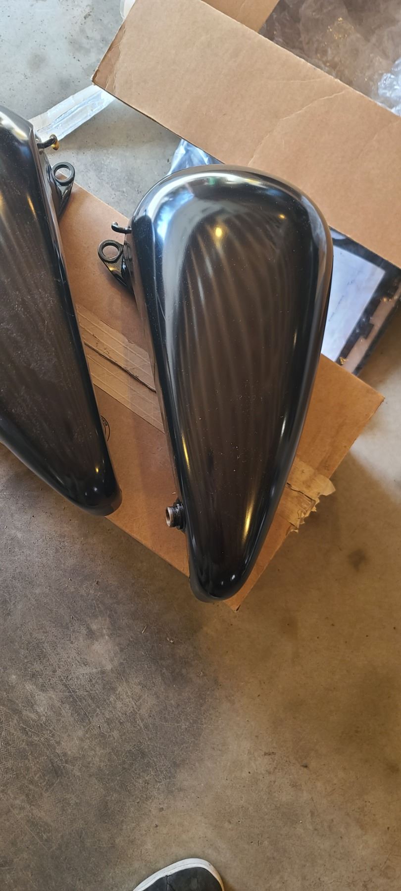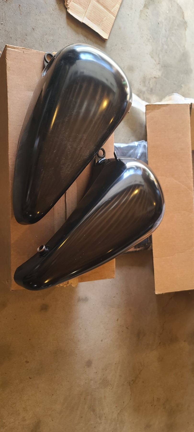 SET OF FAT BOB HARLEY DAVIDSON FUEL TANKS - LOOKS LIKE 3.5GSL COMES WITH MOUNTING AND FUEL ACCESSORIES IN BOX