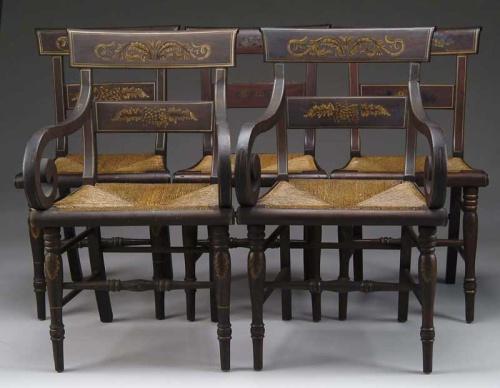 SET OF FIVE DECORATED RUSH SEAT DINING CHAIRS. Set consists of two armchairs and three side chairs. Two of the side chairs have different paint decoration but are identical in form and background color. They have a curved back crest and horizontal slat, turned legs with front turned stretcher. Nice old rush seat and gold highlights with stencil decoration. PROVENANCE: From a fine East Winthrop, Maine home. SIZE: Armchair is 35” h; Side chair is 34” h. 18-1/2” seat h. CONDITION: Very good. 9-27788