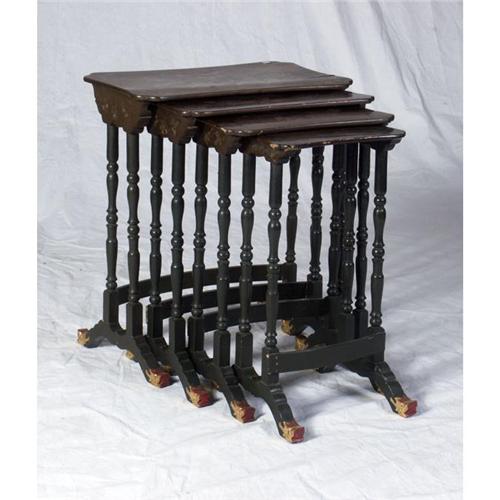 NESTING TABLES: Set of four Asian influence nesting tables, each with painted reliefs, turned legs on trestle bases.