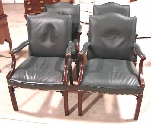 SET OF FOUR LEATHER ARM CHAIRS. Green leather backs & seats. Legs show signs of scratching. 38.5” H to top of back, 27” W