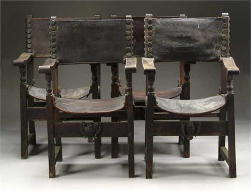 SET OF FOUR LEATHER ARMCHAIRS. 19th Century or earlier. Front carved flat stretcher with shield and scrolls. Flat curving arms with heavy leather seats. SIZE: 44-3/4” h x 19” seat h x 25” across arms. CONDITION: Some wear and cracking to leather. Some upholstery brass buttons missing with some worm damage. 9-26670