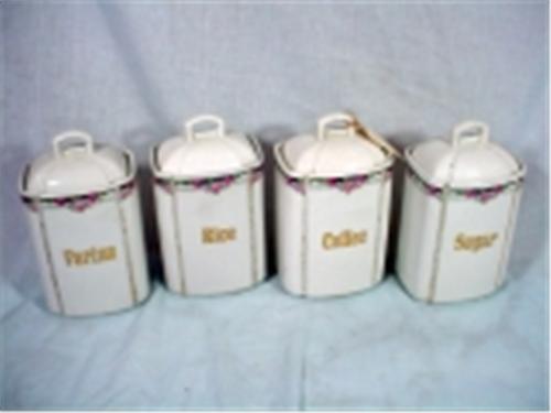 SET OF FOUR PORCELAIN CANNISTERS MARKED GERMANY IN A CHINTZ AND GOLD BORDER LABELED FARINA, RICE, COFFEE, AND SUGAR 8.5" X 5" X 4".
